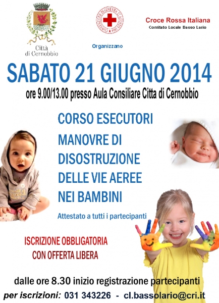 L’Amministrazione Comunale di Cernobbio e la Croce Rossa Italiana Comitato Locale Basso Lario organizzano un “corso esecutori manovre di disostruzione delle vie aeree nei bambini” che si svolgerà sabato 21 giugno, dalle ore 8.30 alle 13.00 circa presso la sala consiliare del Comune di Cernobbio, in via 5 Giornate n. 2.